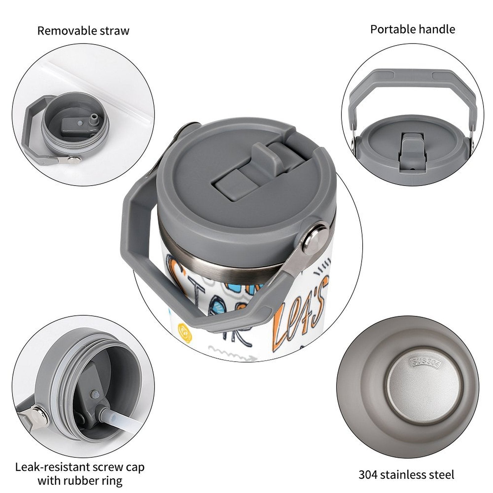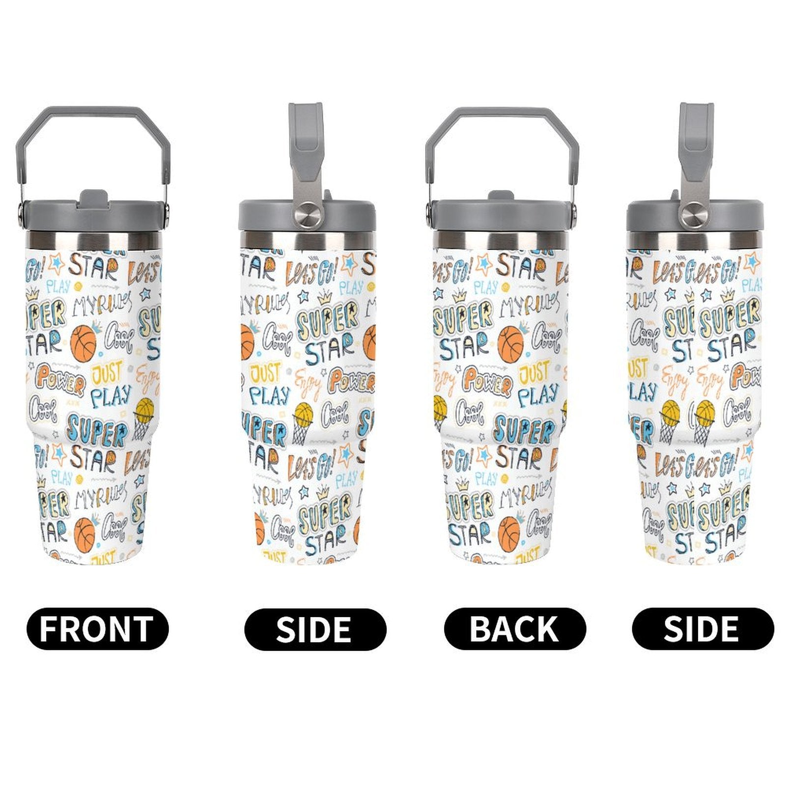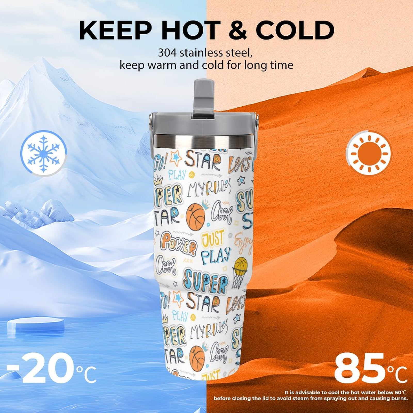 • Made of premium stainless steel, durable and non-toxic. • Flip straw lid design, convenient to open and close. • Features a top handle, makes it easy to carry. • Double wall insulation keeps drink warm or cold. • Capacity: 30 Oz, large capacity, suitable for a variety of occasions. • Hand wash ONLY with soapy hot water.