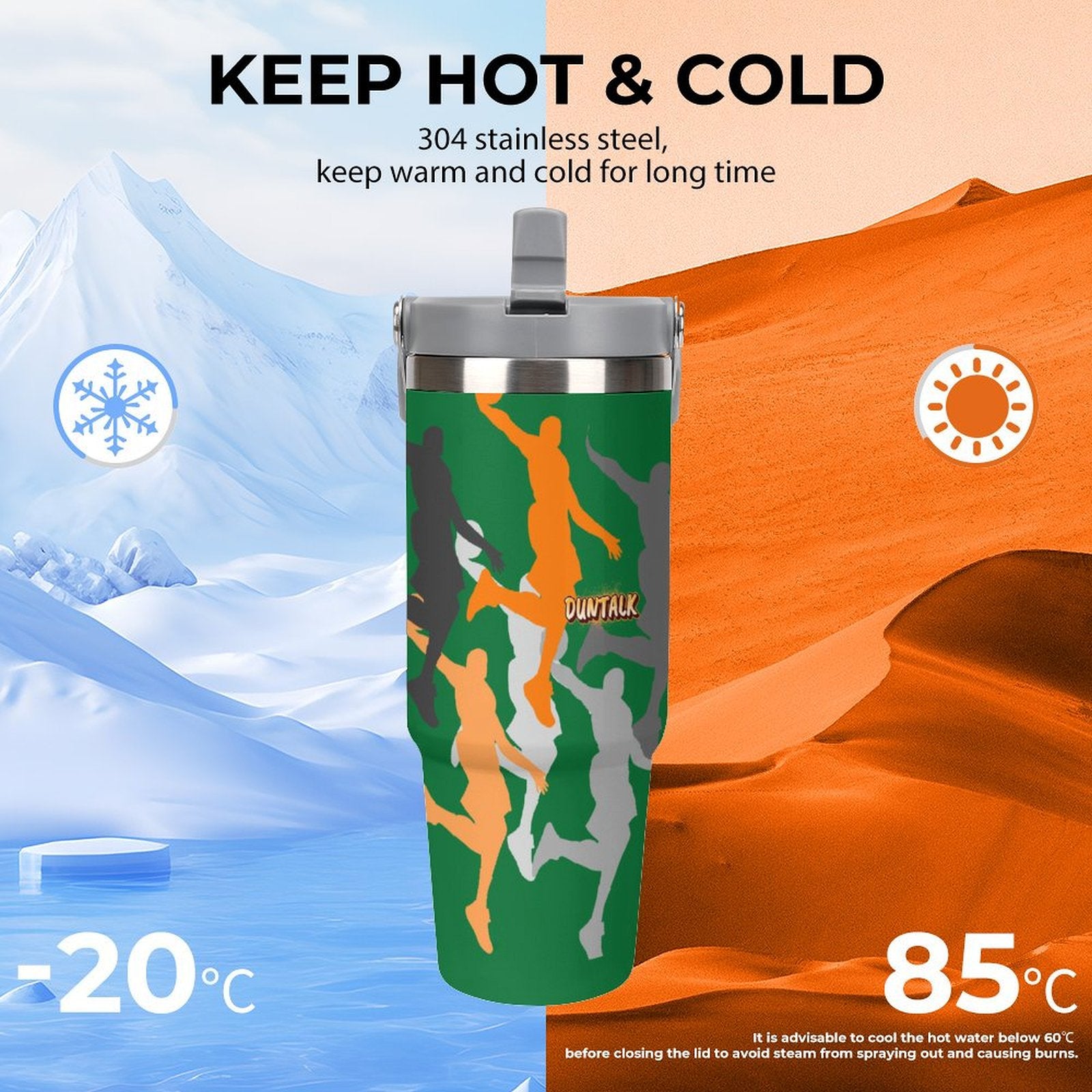 • Made of premium stainless steel, durable and non-toxic. • Flip straw lid design, convenient to open and close. • Features a top handle, makes it easy to carry. • Double wall insulation keeps drink warm or cold. • Capacity: 30 Oz, large capacity, suitable for a variety of occasions. • Hand wash ONLY with soapy hot water.